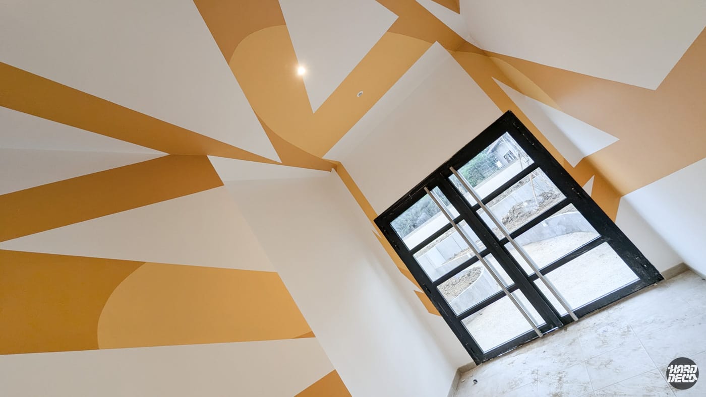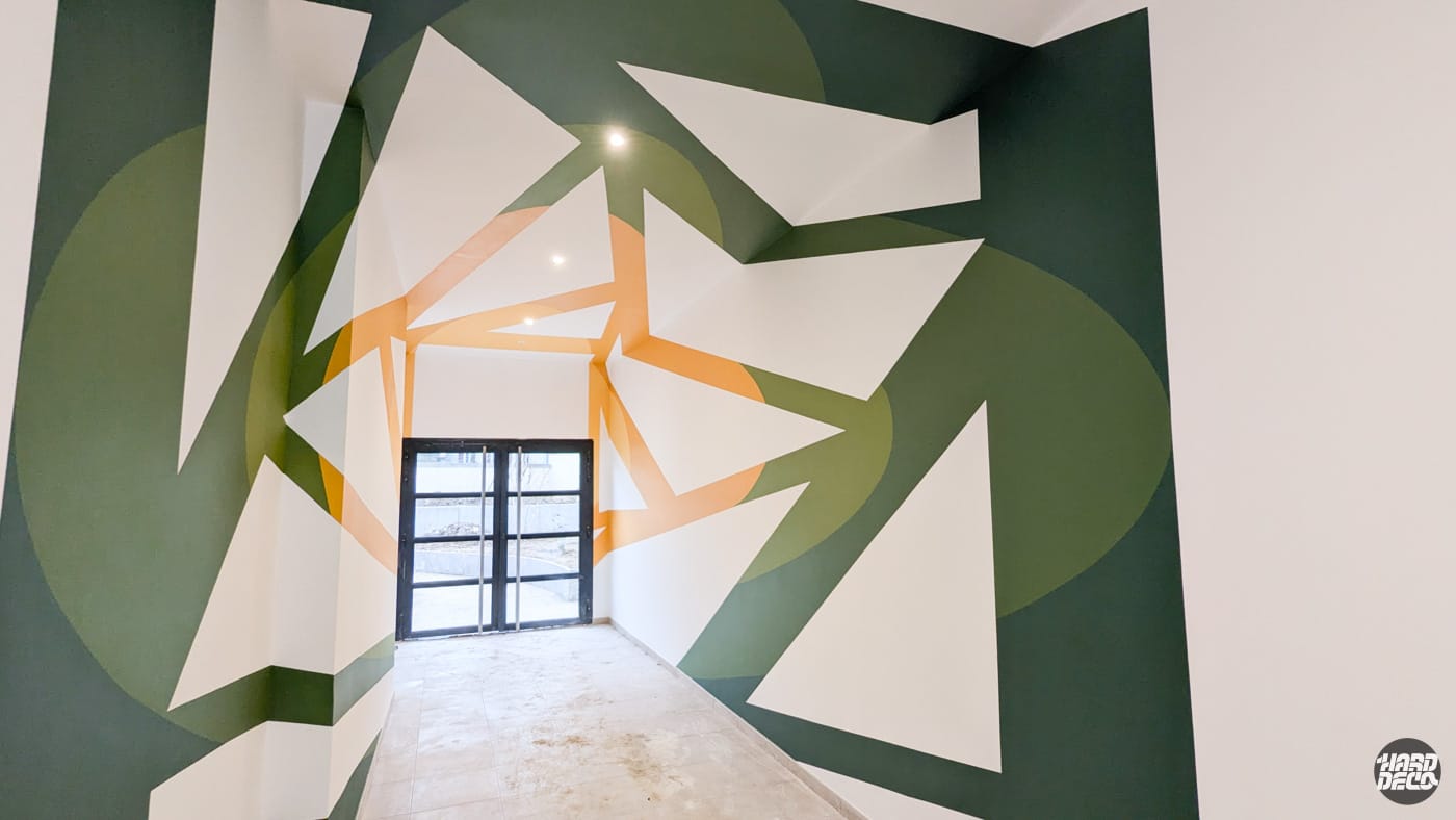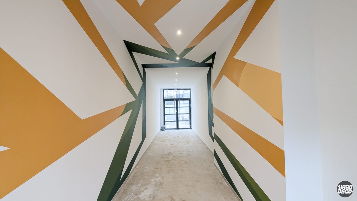 Pour le promoteur immobilier SogeProm, à la demande de la société P-A-L-M, Hard Déco a conçu et réalisé une anamorphose murale spectaculaire dans le couloir d’entrée d’une résidence d’appartements. L’artiste Shero a déployé une composition géométrique abstraite sur l’ensemble des surfaces — murs, plafond et continuité visuelle — créant un effet de profondeur et de mouvement saisissant dès le franchissement du seuil.Jouant sur des formes triangulaires et obliques dans une palette vert forêt, vert kaki et ocre doré, l’œuvre transforme un simple couloir de passage en une expérience visuelle immersive. Selon le point de vue du visiteur, la composition se reconfigure et révèle de nouvelles perspectives, offrant à chaque résident une entrée mémorable et une identité visuelle forte pour la résidence.Cette réalisation illustre notre maîtrise de l’anamorphose architecturale — une technique exigeante qui nécessite une conception en amont rigoureuse pour que les déformations calculées se reconstituent parfaitement dans l’espace réel.
